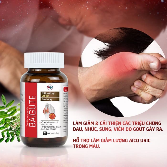 Viên uống Baigute với các thành phần từ thiên nhiên giúp hỗ trợ giảm acid uric trong máu, cải thiện các triệu chứng: sưng, đau các khớp do gout.